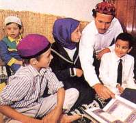 Chez les musulmans, chaque âge de la vie est marqué par des rites religieux. A la naissance, le premier mot que l'on doit murmurer à l'oreille du nouveau-né est Dieu (ou Allah). L'enfant reçoit son nom sept jours plus tard. Puis, à l'âge de 4 ans, on lui donne sa première leçon d'éducation religieuse, en attendant qu'il fasse régulièrement sa prière à partir de 7 ans. Avant d'avoir atteint cet âge, le garçon est circoncis (c'est plus une mesure d'hygiène qu'un rituel religieux). Cette cérémonie donne lieu à une grande fête familiale, tout comme le mariage, qui peut durer plusieurs jours. Les futurs mariés se rendent à la mosquée assistés de deux témoins et du tuteur de la fiancée (généralement son père ou son oncle). |